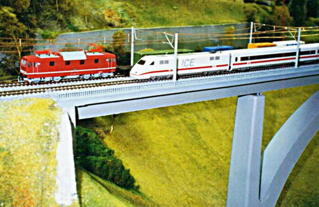 Auf mehrfachen Wunsch unserer vielen „H0-Bahner“ begannen wir 1995 erneut mit dem Bau einer größeren Gemeinschaftsanlage. Im April des Jahres wurde mit der Planung der neuen Segmentanlage, mit 6 Anlagenteilen, begonnen. Zwei unabhängig voneinander und gegeneinander führende Hauptstrecken prägen das Bild der H0-Segmentanlage. Die 12,60m x 1,30m große Anlage, mit ca. 180m Gleismaterial und etwa 40 Weichen, ist mit einer Oberleitung überspannt, so dass E-Lokomotiven vorbildgerecht, mit angelegtem Stromabnehmer fahren können. Auf der 2-gleisigen Hauptstrecke können bis zu 20 Züge verkehren. Der im Hintergrund versteckte, 2-gleisige vollautomatische Schattenbahnhof sorgt für eine Abwechslung in der Zugreihenfolge und bietet den Lokomotiven eine künstliche, aber willkommene Pause. An den Signalen des Streckenblocksystems können verschiedene Signalbilder angezeigt werden.